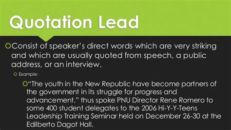 Quotation Lead News Example - See examples of different types of leads and how to avoid. That said, beginning writers can abuse certain kinds of leads. These include leads that begin with a question or direct quotation and those that make a direct appeal using the word you. It provides examples of different types of feature stories and offers tips on writing techniques, such as.